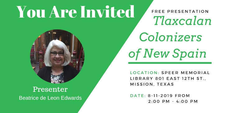• 2:15 PM - Presentation "Tlaxcalan Clonizers of New Spain" - by Beatrice de Leon Edwards